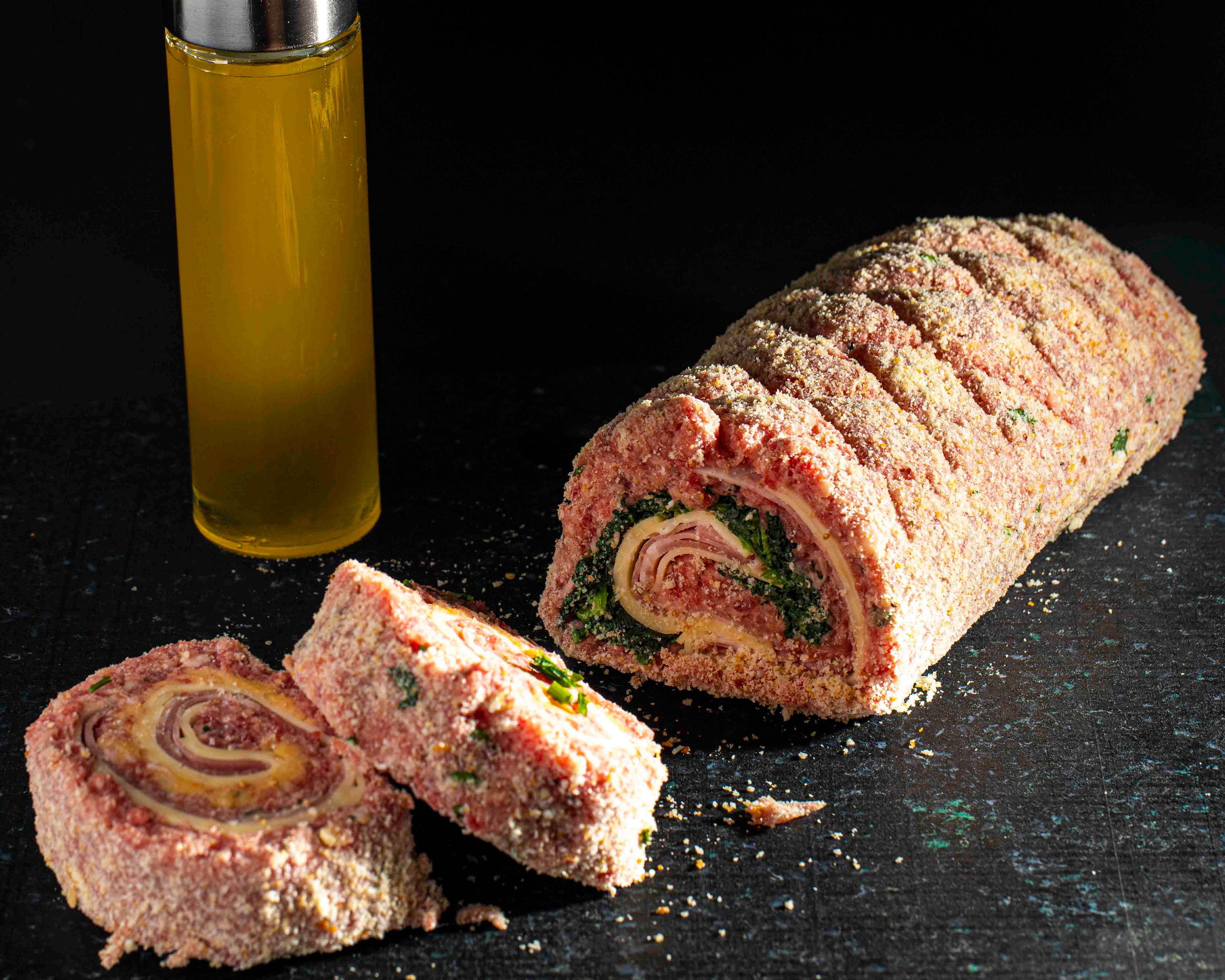 Ingredienti: carne tritata, prosciutto cotto, provola dolce, spinaci, pangrattato.
